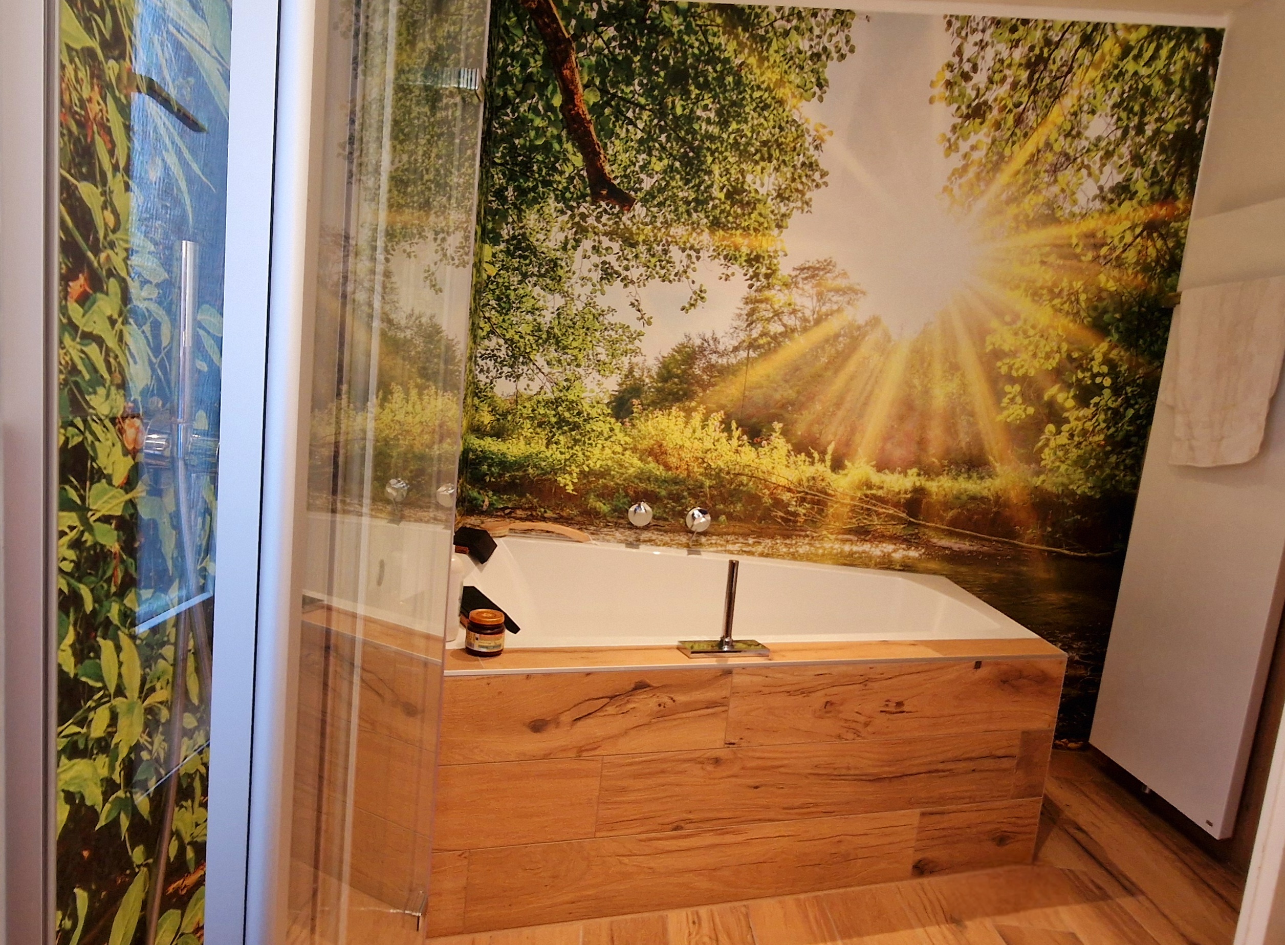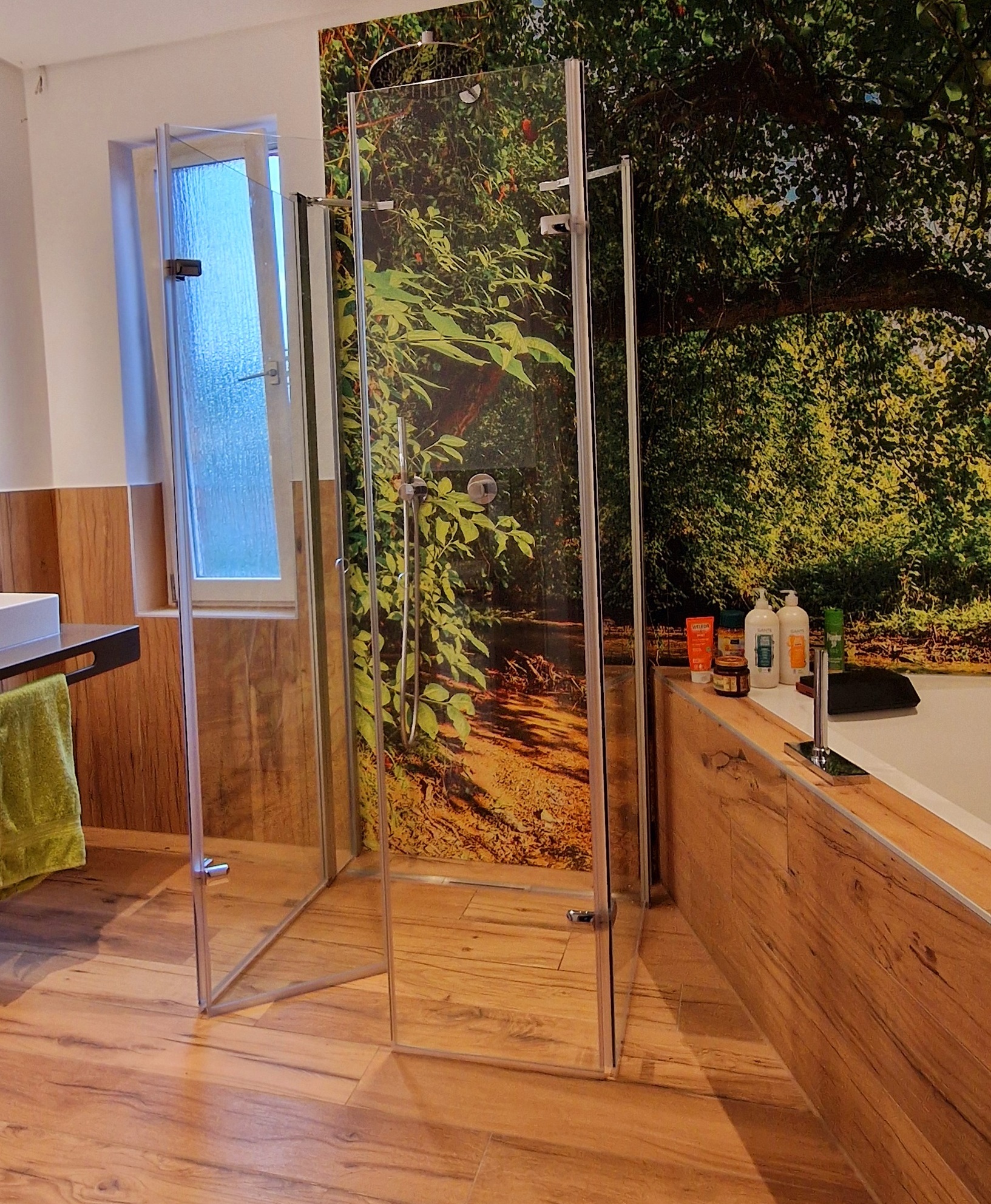 Aus einem in die Jahre gekommenen Bad mit rosa Fliesen, Badewanne und klassischem Waschbecken haben wir eine moderne Wellness-Oase geschaffen. Die Kunden wünschten sich ein Bad im Natur-Look mit beruhigenden Waldmotiven, fugenlosen Wandverkleidungen und Fliesen in stilvollem Holzdekor – gesagt, getan! 🌿🛁